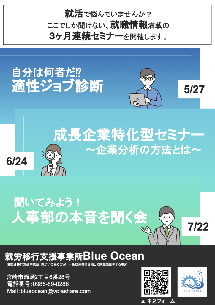 「自分は何者だ!?適性ジョブ診断」と題して開催いたします。 必見です! スクロールできます 開催日 2023年5月27日(土)15:00〜16:30 内容 1部【自分は何者だ!?適性ジョブ診断】2部【ブースごとのトーク会(参加自由)】 定員 10名(現地参加限定) 場所 就労移行支援事業所Blue Ocean宮崎市瀬頭…